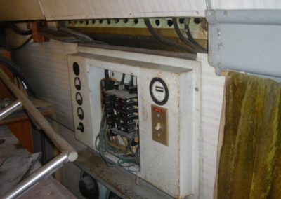 This is the “ever so lovely” main power panel. (After removing a rats nest of brittle wires). We found a Readers Digest book beside it, titled “Home Wiring Made Easy.” We’ll blame the previous owner. I doubt that WFAA would have had such a mess. We did find the cover for the box. Yea!